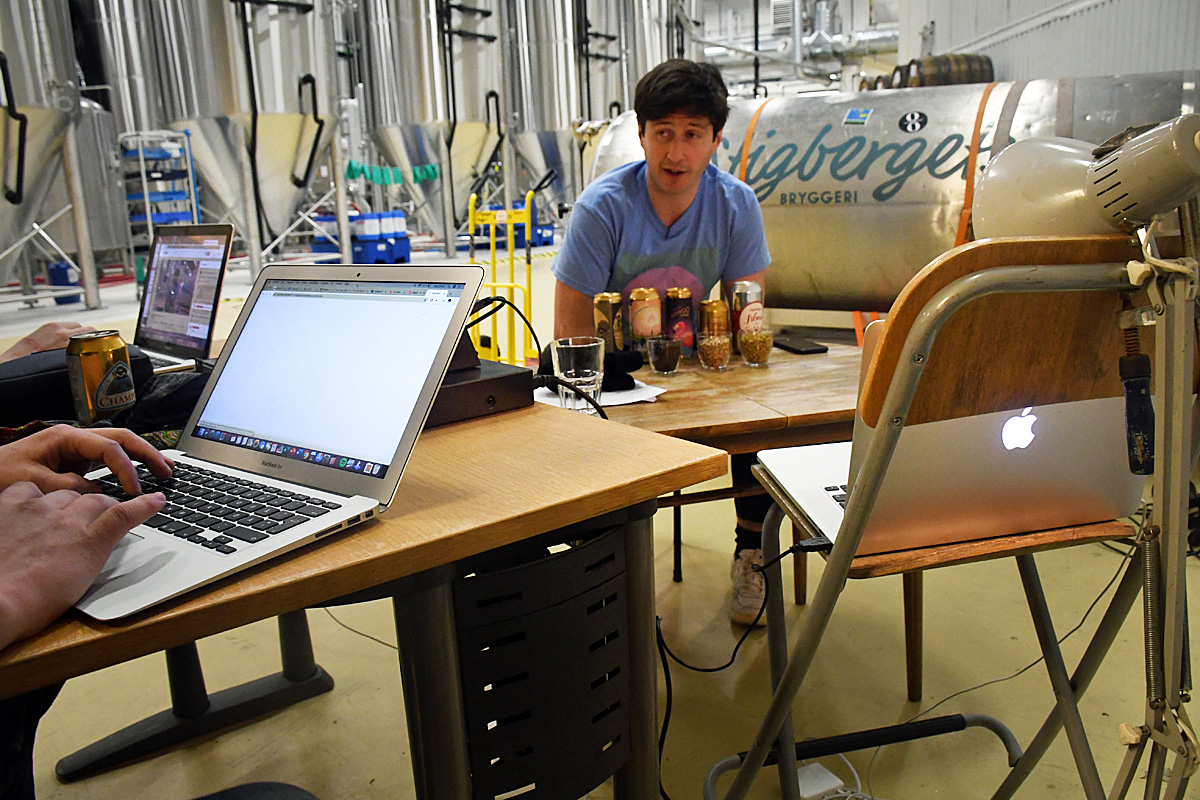 Kameran på en dator och en mikrofon räckte långt och den lilla studion var placerad så att tittarna kunde se en del av de stora jästankar som finns i bryggeriet.