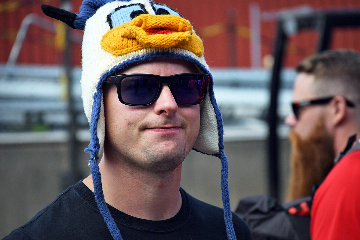 Sebastian Sahlin hade lite tveksamheter kring sin klädsel med tanke på värmen, men tänkte köra mössa så länge det gick.