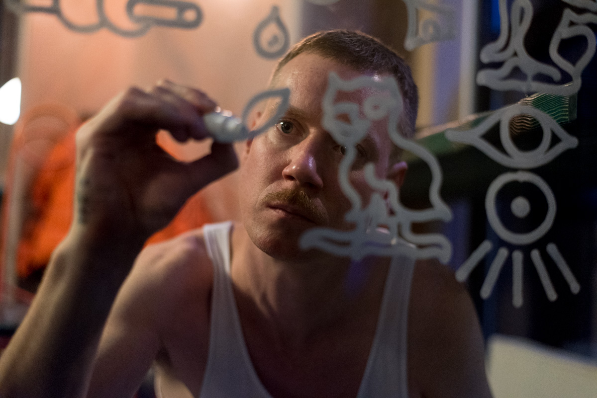 Dessförinnan har han hållit på in i det sista med måla hieroglyfer på en glasvägg vid entrén.