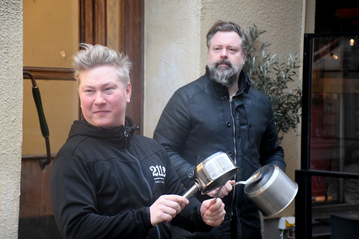 Coffe Holmström och Peter Iwers på 2112 slamrade med grytor för att uppmärksamma det gällande läget för landets restauranger.