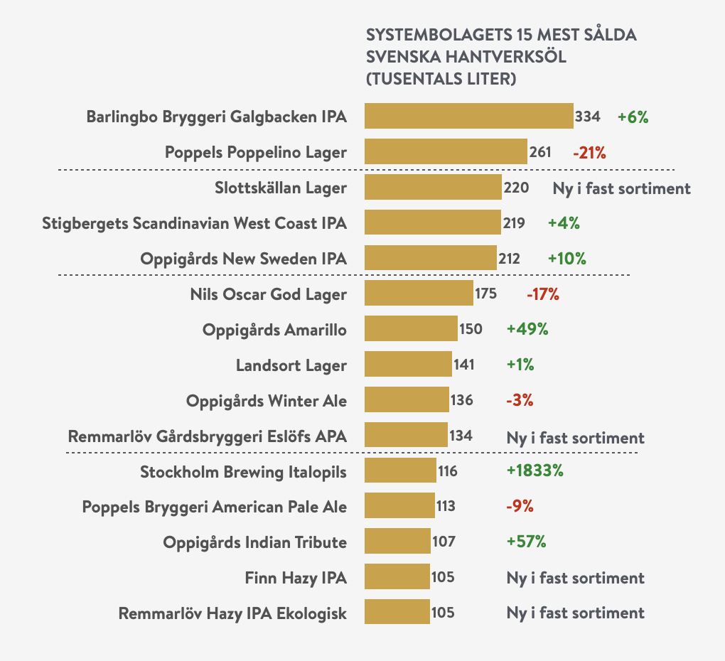 Förra årets mest sålda hantverksöl, Poppels lågprisöl Poppelino Lager, har under 2025 tappat 21 procent (vilket motsvarar 70 000 liter) och lämnat förstaplatsen till Galgbacken IPA från Barlingbo som blev Sveriges mest sålda hantverksöl med 334 000 liter 2025.