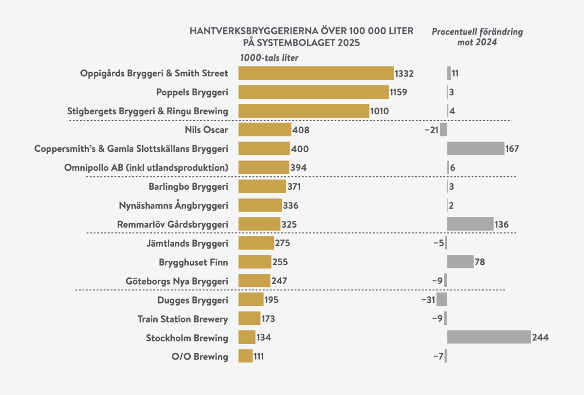 Nyligen rapporterade Beernews att svenska hantverksbryggeriers försäljning ökade med 3,4 procent på Systembolaget under 2025. Men vilka är landets största hantverksbryggerier? Vilka växer respektive tappar, och vilka enskilda öl säljer mest?