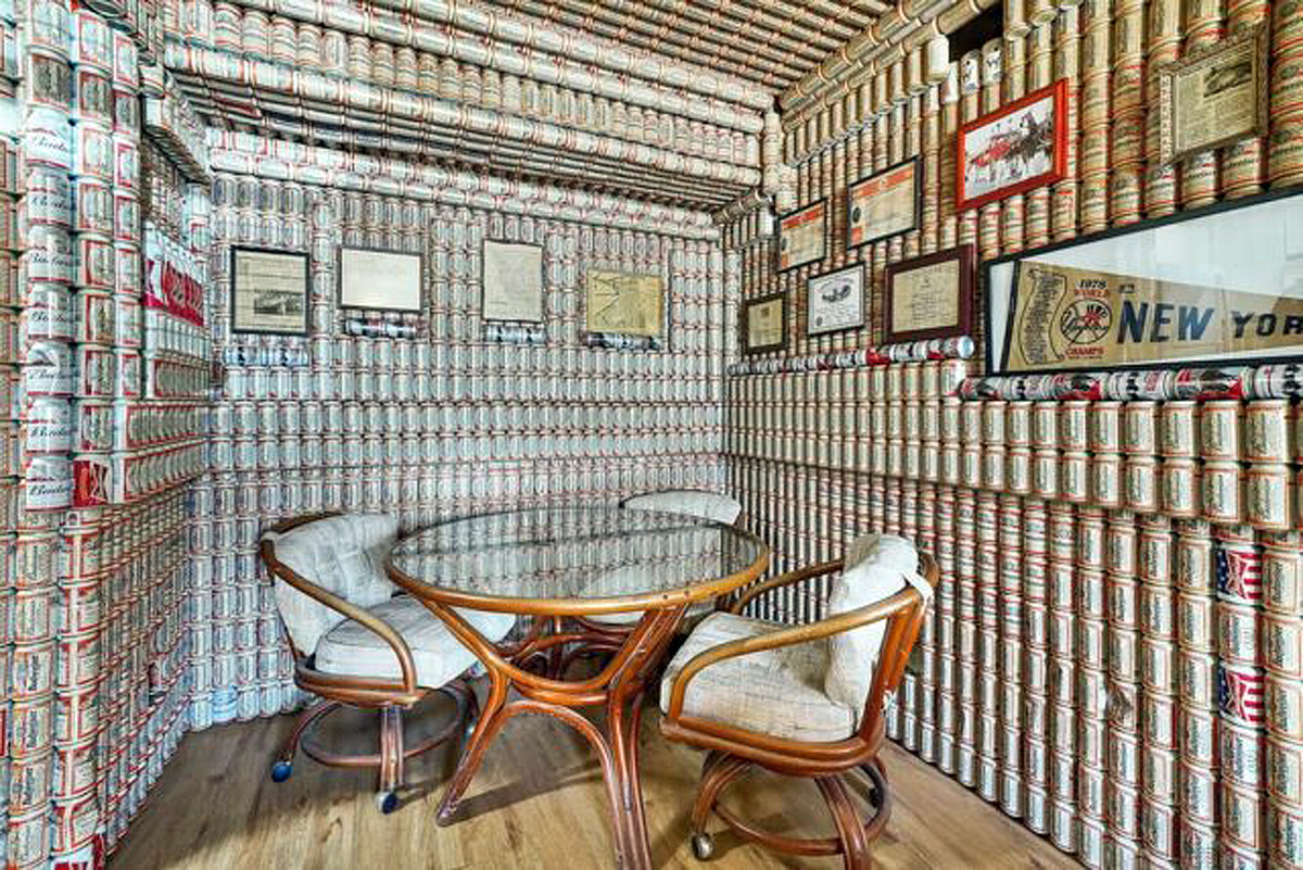 Den tidigare ägaren har inte bara ställt upp burkarna utan även varit noga med att placera dom så att det bildar ett mönster i varje rum. Till och med toaletten är dekorerad med ölburkar från golv till tak.