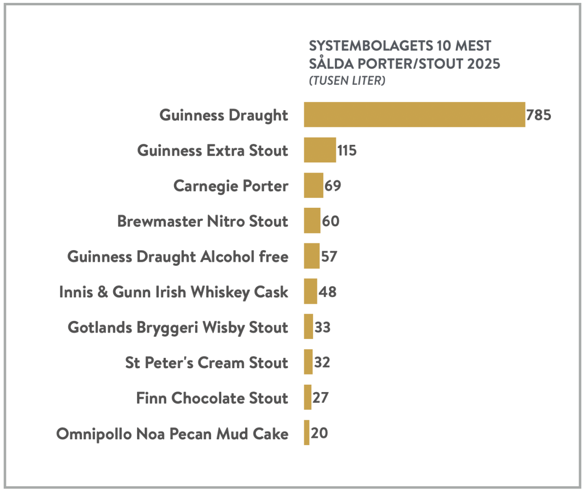 En genomgång av Systembolagets statistik över de tio mest sålda produkterna inom kategorin porter och stout visar en tydlig dominans. Guinness Draught toppar listan med 785 000 sålda liter. Varumärket tar även andraplatsen med den något starkare Guinness Extra Stout och femteplatsen med alkoholfri Guinness. Klassikern Carnegie Porter hamnar på tredje plats med 69 000 liter.