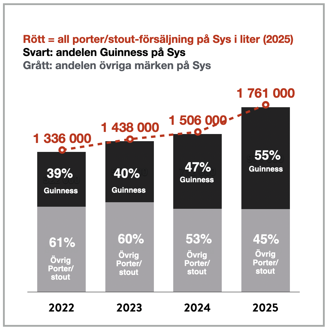 Den snabba tillväxten har också förändrat kategorins struktur. År 2022 stod Guinness för 39 procent av Systembolagets porter- och stoutförsäljning. Datan från 2025 visar att andelen nu vuxit till 55 procent av den totala kategoriförsäljningen på 1,76 miljoner liter.