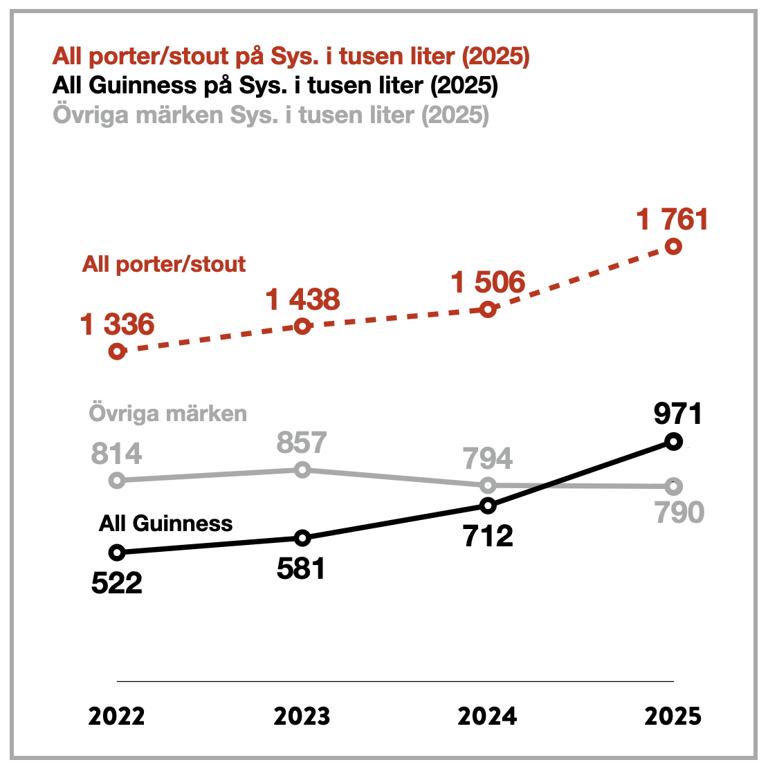 Mellan 2022 och 2025 ökade Guinness försäljning på Systembolaget med 86 procent. Under 2025 sålde varumärket totalt 971 000 liter, vilket är en ökning med 260 000 liter jämfört med året innan.