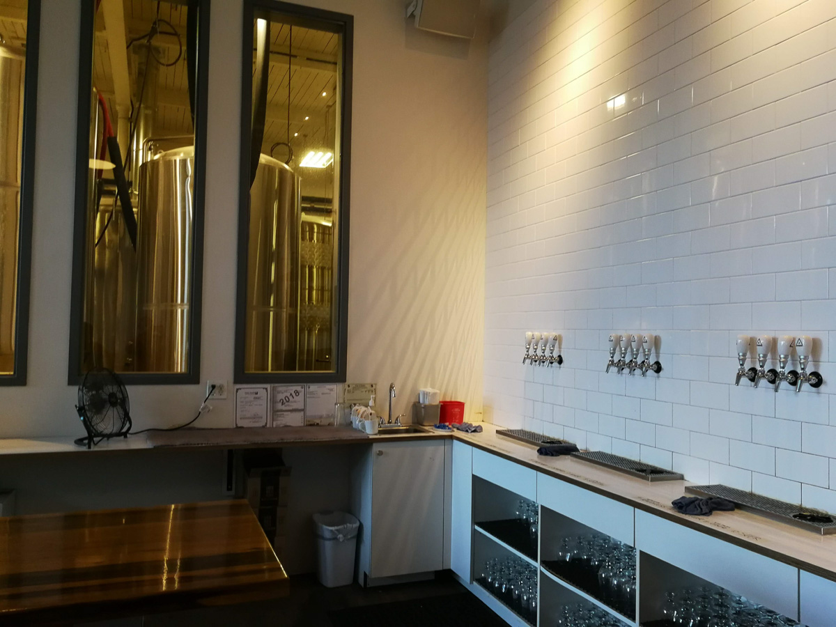 Bryggeriet hade en snygg, vitmålad pub med bordsservering och utsikt mot solnedgången – och tågspåren. Ingen avsmakningsbricka men 6 oz i taget (ca 15 cl) fungerade för att prova några olika öl. Först fick vi några stabila Iindia pale ales – både grumliga och klara – men uppmanades av vår servitris att inte blanda med det funkiga. Så först därefter fick vi ett par milt brettade saison, som var riktigt balanserade och goda.
