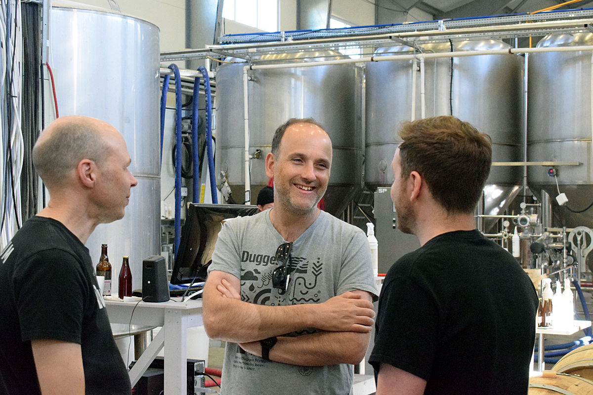 Darron Anley var tillbaka i Göteborg för den här specialbryggningen. Här i diskussion med Calle Tiger från Dugges och Denis Johnstone från Buxton.