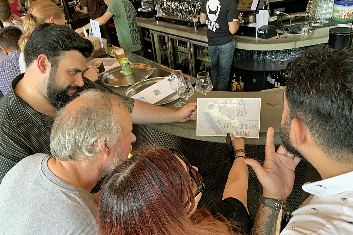 Finbesök i baren. Roberto Ross och Mike James från Brasserie Phantome, Danai Vafiadis, Bar Manager Brewdog Brysse och Rick Soriano, Gueuzerie Tilquin valde bland de olika svenska ölen.