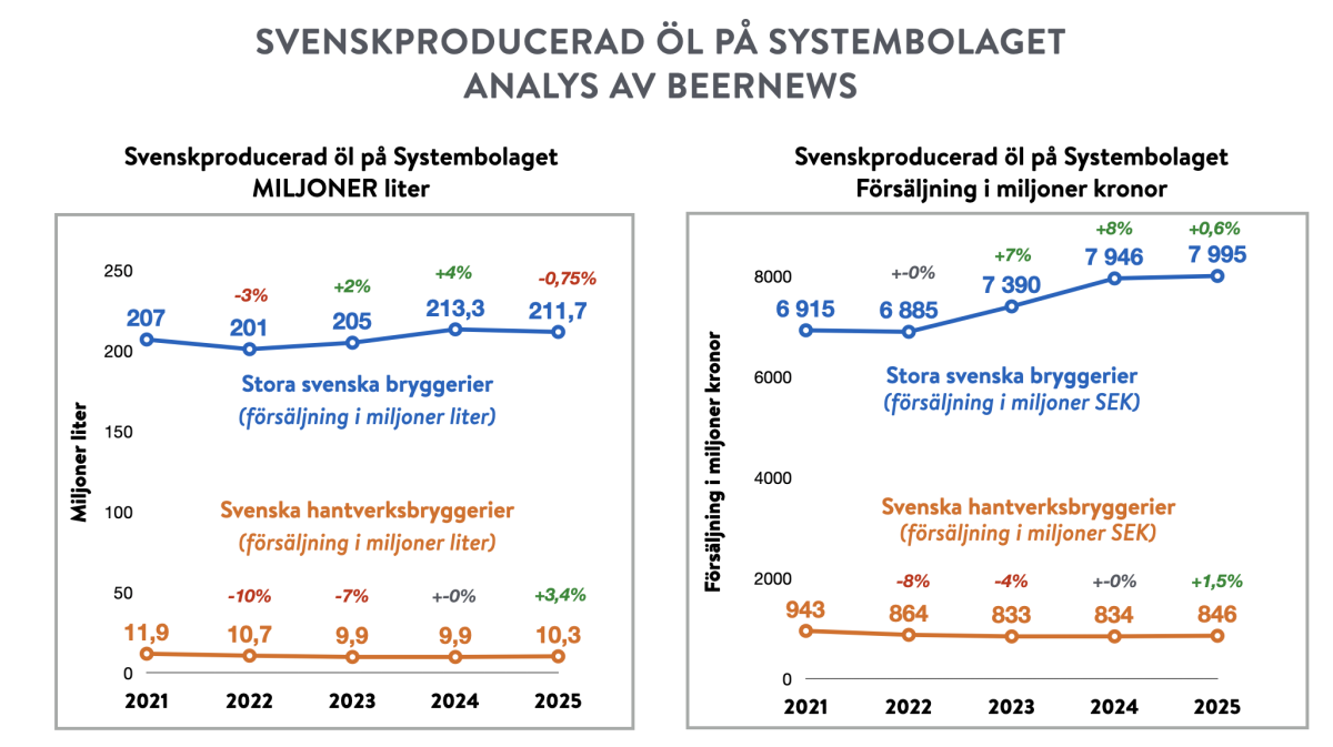 Vinnaren inom ölkategorin är svenska hantverksbryggerier, som ökade sin försäljning med 3,4 procent, motsvarande en ökning om cirka 330 000 liter. Totalt såldes 10,3 miljoner liter svensk hantverksöl under 2025. Det är den första uppgången på flera år, efter att volymerna minskat kontinuerligt mellan 2021 och 2024.